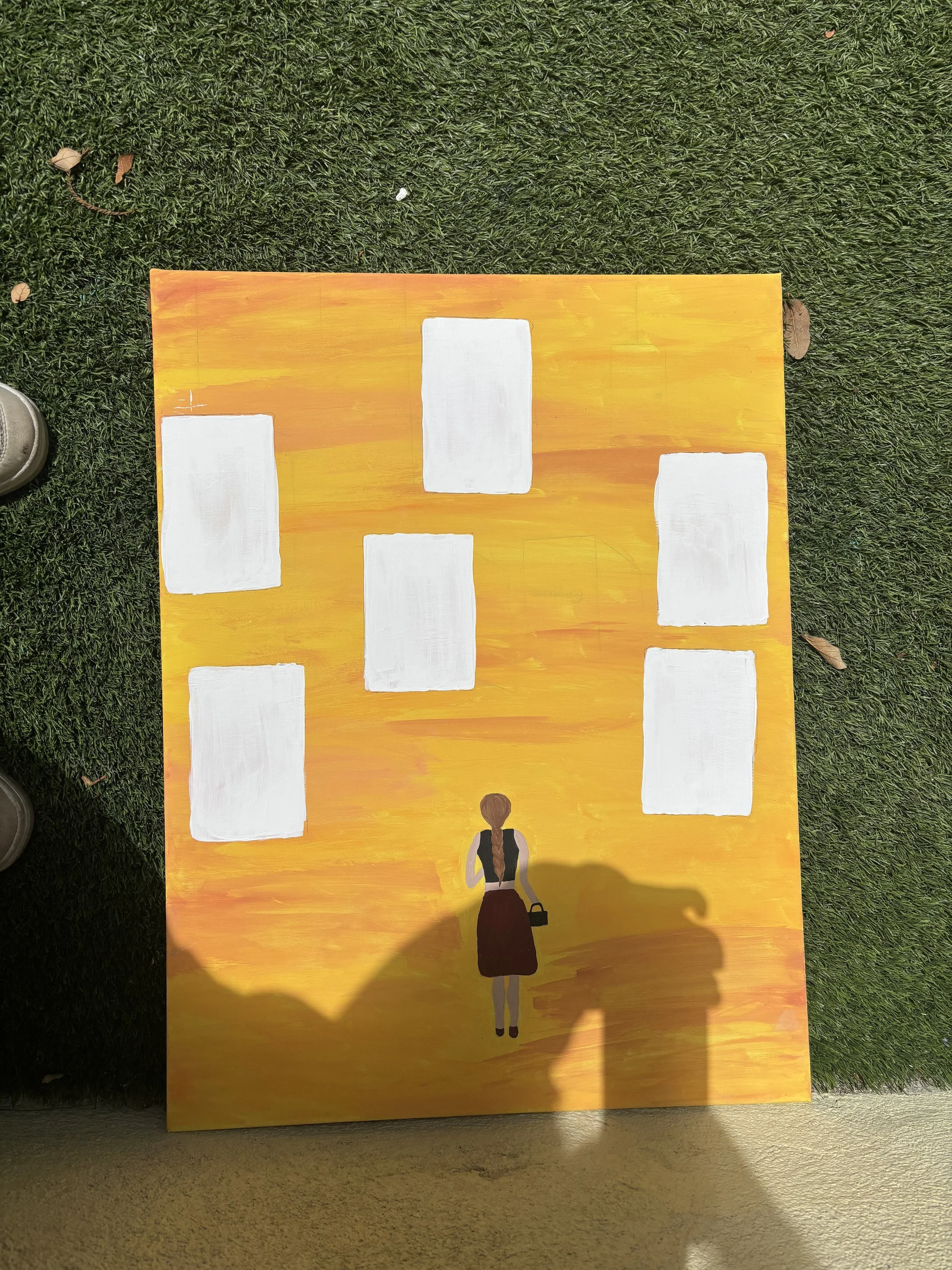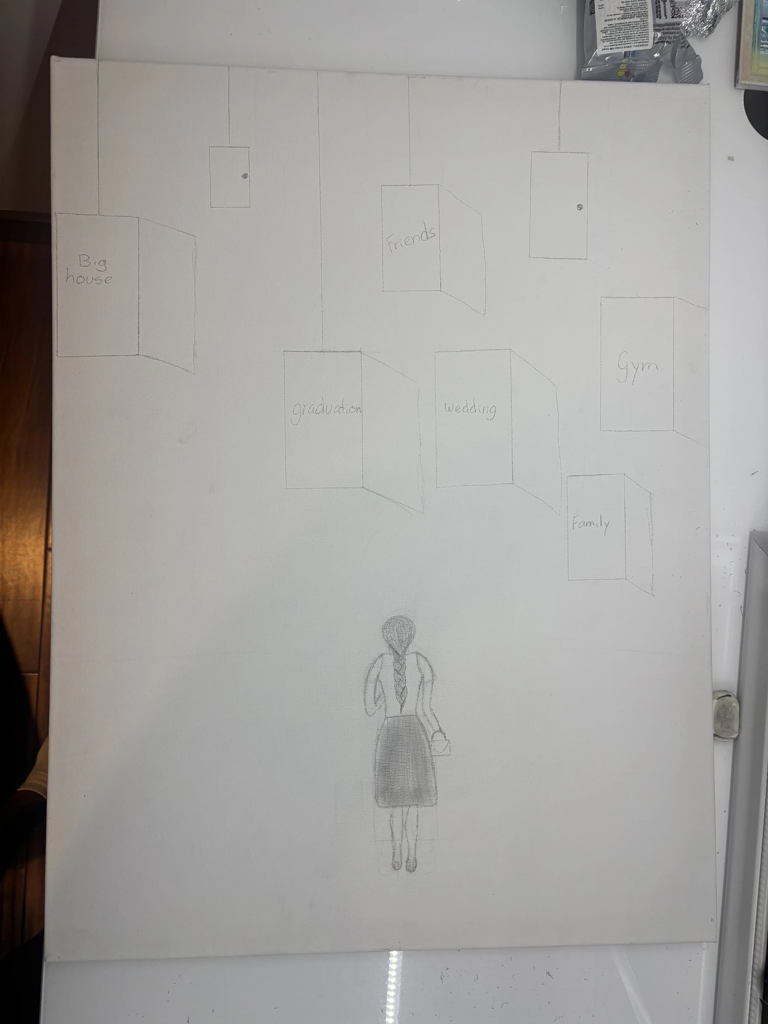 “I will be creating a painting with me walking in a dark room with doors hanging from the ceiling, with some of them closed and some open. In the open ones...”